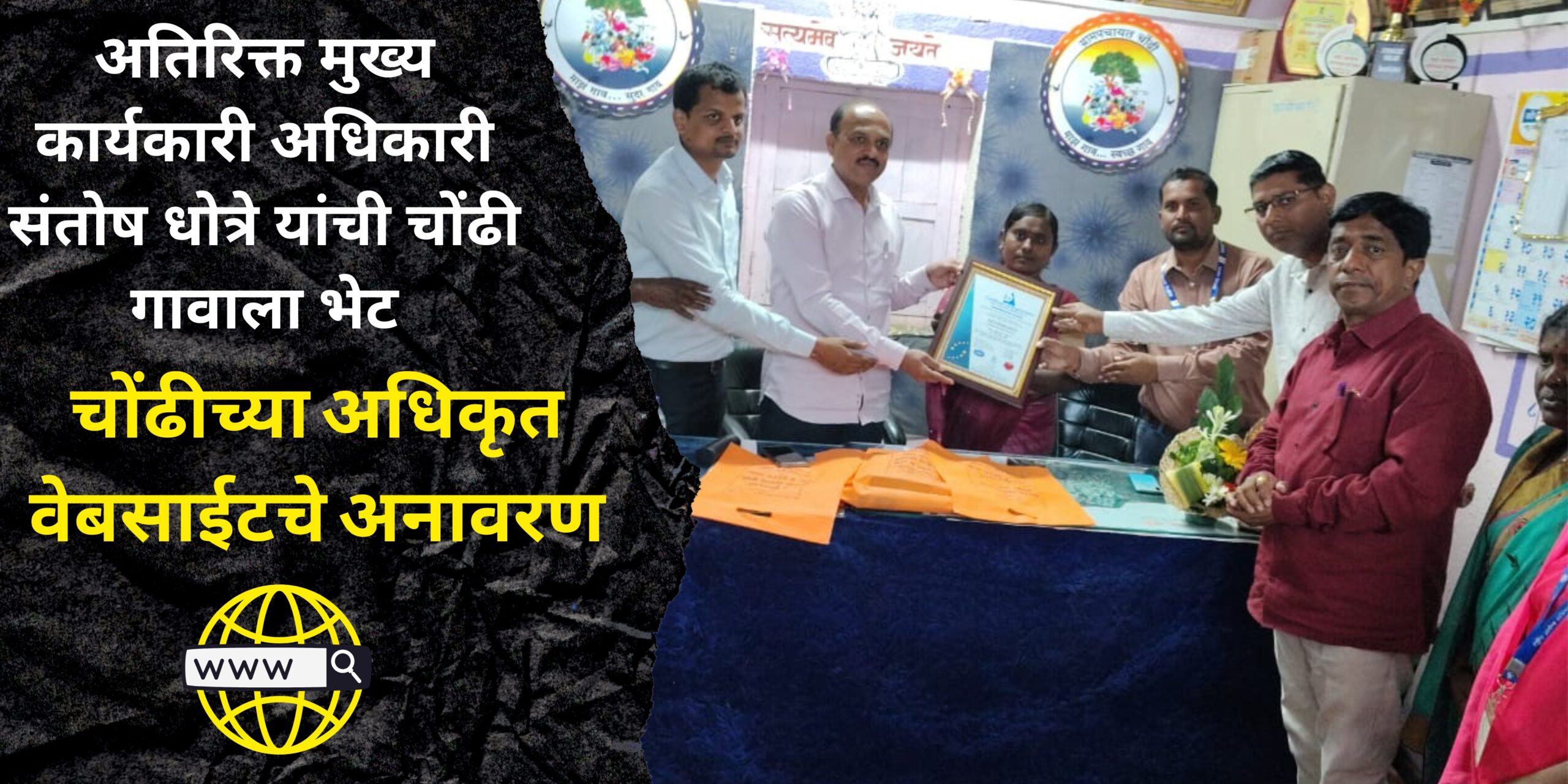 ग्रामपंचायतीने केलेल्या नियोजनबद्ध कामकाजाची परिपूर्ण माहिती घेऊन श्री. धोत्रे यांनी समाधान व्यक्त केले. तसेच भविष्यात येणाऱ्या तपासणी चमूसाठी ग्रामपंचायतीला शुभेच्छा दिल्या. यावेळी ग्रामपंचायत चोंढीच्या अधिकृत वेबसाईटचे अनावरण त्यांच्या हस्ते करण्यात आले. पर्यावरणपूरक उपक्रमांतर्गत कापडी पिशव्यांचे वितरणही करण्यात आले.