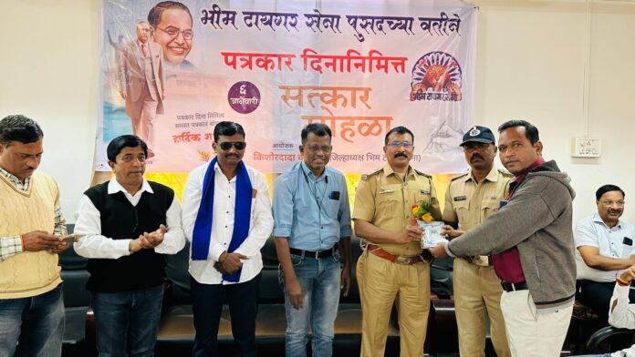 पुसद – येथील विश्रामगृह येथे दरवर्षीप्रमाणे याही वर्षी भिम टायगर सेनेच्या वतीने पत्रकार बांधवांचा सत्कार समारंभ घेण्यात आला. या कार्यक्रमाला अध्यक्ष म्हणून पुसद शहरचे कर्तव्य दक्ष ठाणेदार सेवानंद वानखेडे साहेब उपस्थित होते, तर प्रमुख पाहुणे म्हणून पंचायत समितीचे सहाय्यक गटविकास अधिकारी संजय राठोड साहेब ,पुसद ग्रामीणचे कर्तव्यदक्ष ठाणेदार राऊत साहेब, सा.बा. पुसदचे उपविभागीय अभियंता कांबळे साहेब, पोलीस स्टेशन वसंत नगरचे कर्तव्यदक्ष ठाणेदार सतीश जाधव साहेब, जी.प. उपअभियंता सतीश नांदगावकर साहेब, डॉ. शिवाजीराव भुरके, जेष्ठ पत्रकार प्रकाश लामने, प्रा. दिनकर गुल्हाने हे प्रामुख्याने उपस्थित होते.